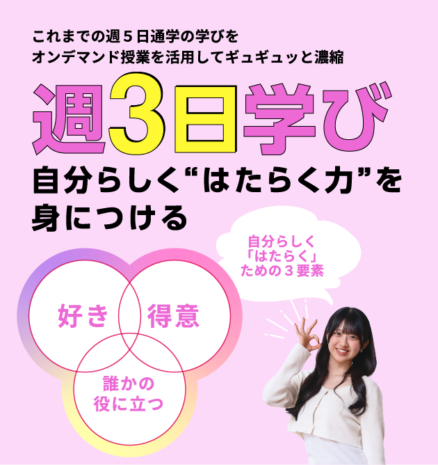 これまでの5日通学の学びを、オンデマンド授業を効果的に活用することで3日に凝縮。空いた2日を、あなたの「得意」や「好き」なことに没頭できるプログラムを用意しました。自分の得意を伸ばして、社会で活躍する力を身につけます。