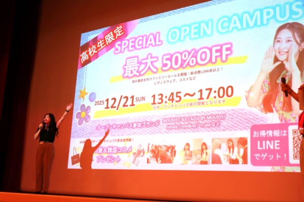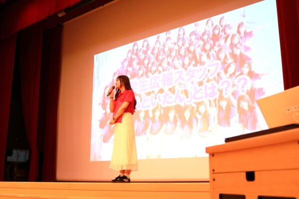 その後は、学生広報スタッフ「チームといたん」の総監督赤山さんが登壇。といたんは「日本一のオープンキャンパスをつくる」を目標に活動する戸板女子短期大学の顔として、全国から注目を集めるブランドチーム。当日は、高校生を全力で応援する明るく元気な姿勢や、学生自身が主体的に学びを発信している様子が紹介され、参加者からは「大学生活が楽しそう」「先輩方がキラキラしていた」といった声が多く寄せられました。