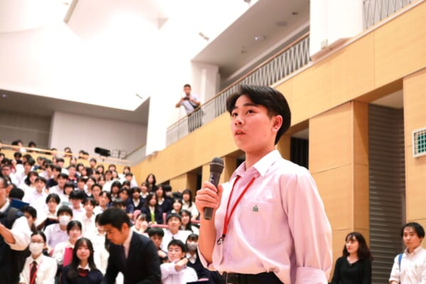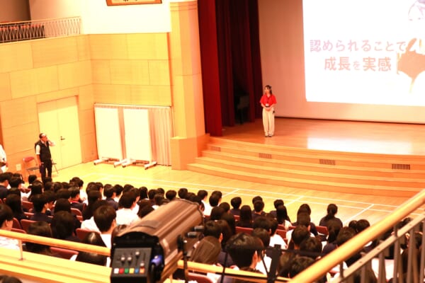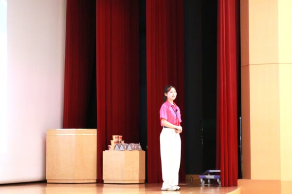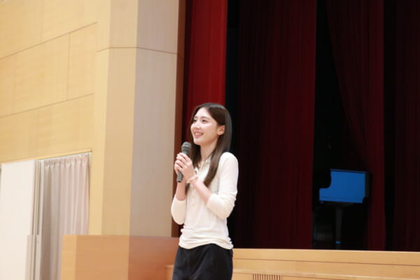 国際コミュニケーション学科2年生の中路さんによる学生プレゼンテーションでは、企業プレゼンコンテスト「TOITAフォーラム」への挑戦が紹介されました。中路さんは中学時代の失敗経験をきっかけに人前で話すことへの苦手意識を抱えていたものの、戸板での学びや先生方のサポートを通じて少しずつ自信を取り戻し、最終的には企業人事担当者の前で堂々とプレゼンを披露するまでに成長したエピソードを語りました。失敗を恐れず挑戦することの大切さ、自分を信じて努力を続ける力強さが聴衆の心に響き、生徒たちは真剣に耳を傾けていました。