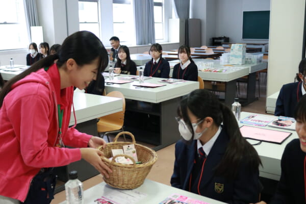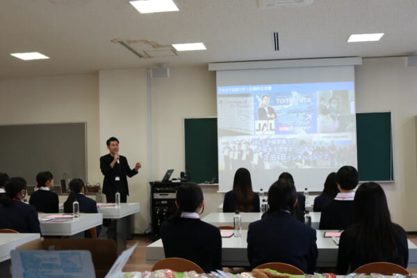 教室が温まったところで学校紹介をスタート!!学科紹介に加え、在学生が企業と共同で商品開発やイベント企画を行う「企業コラボの授業」が紹介されると、生徒のみなさんから驚きと感心の声が上がりました!