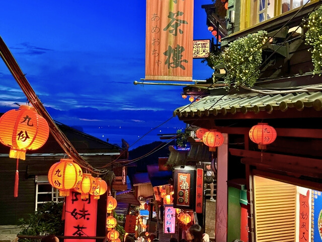 映画の世界のようなノスタルジックな街並みが人気。坂道に広がる茶屋と赤提灯が台湾らしい雰囲気を感じさせます。
