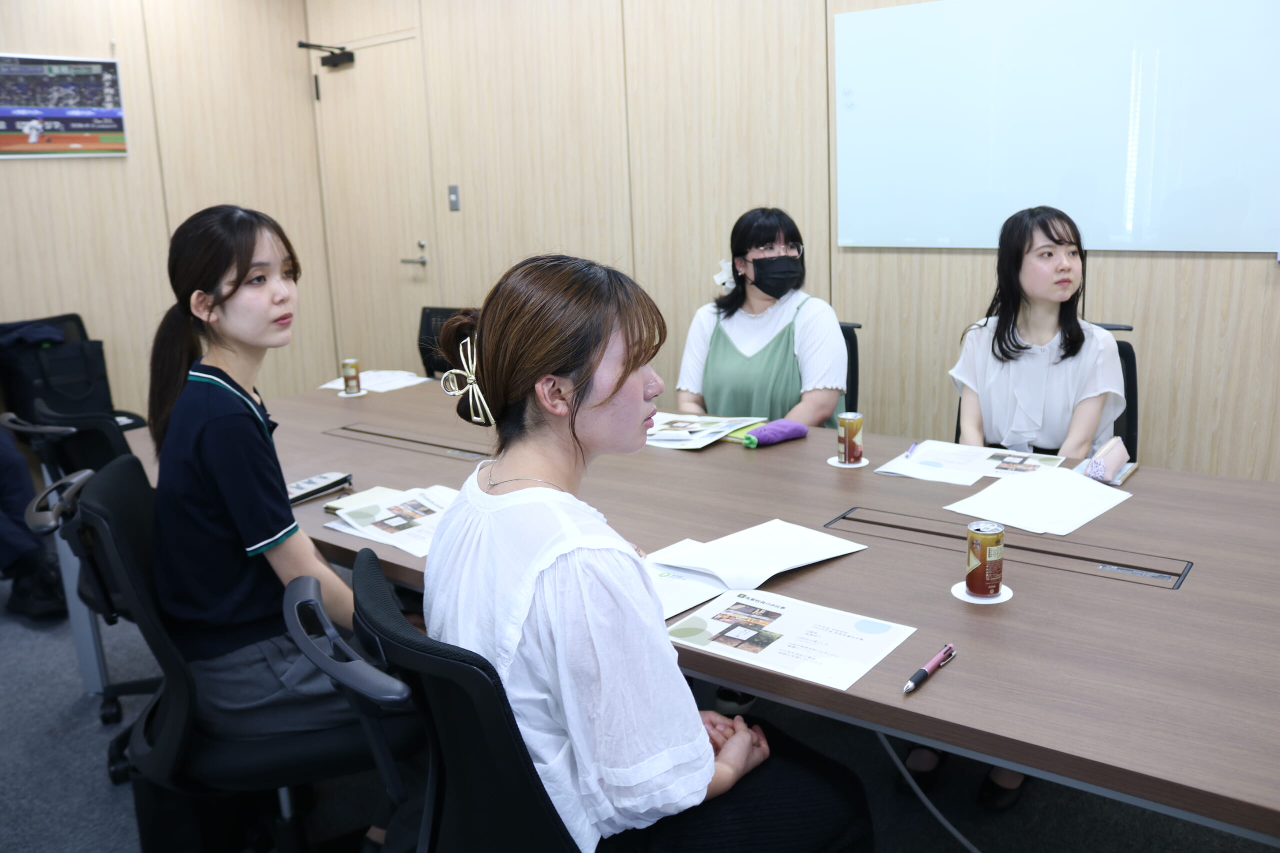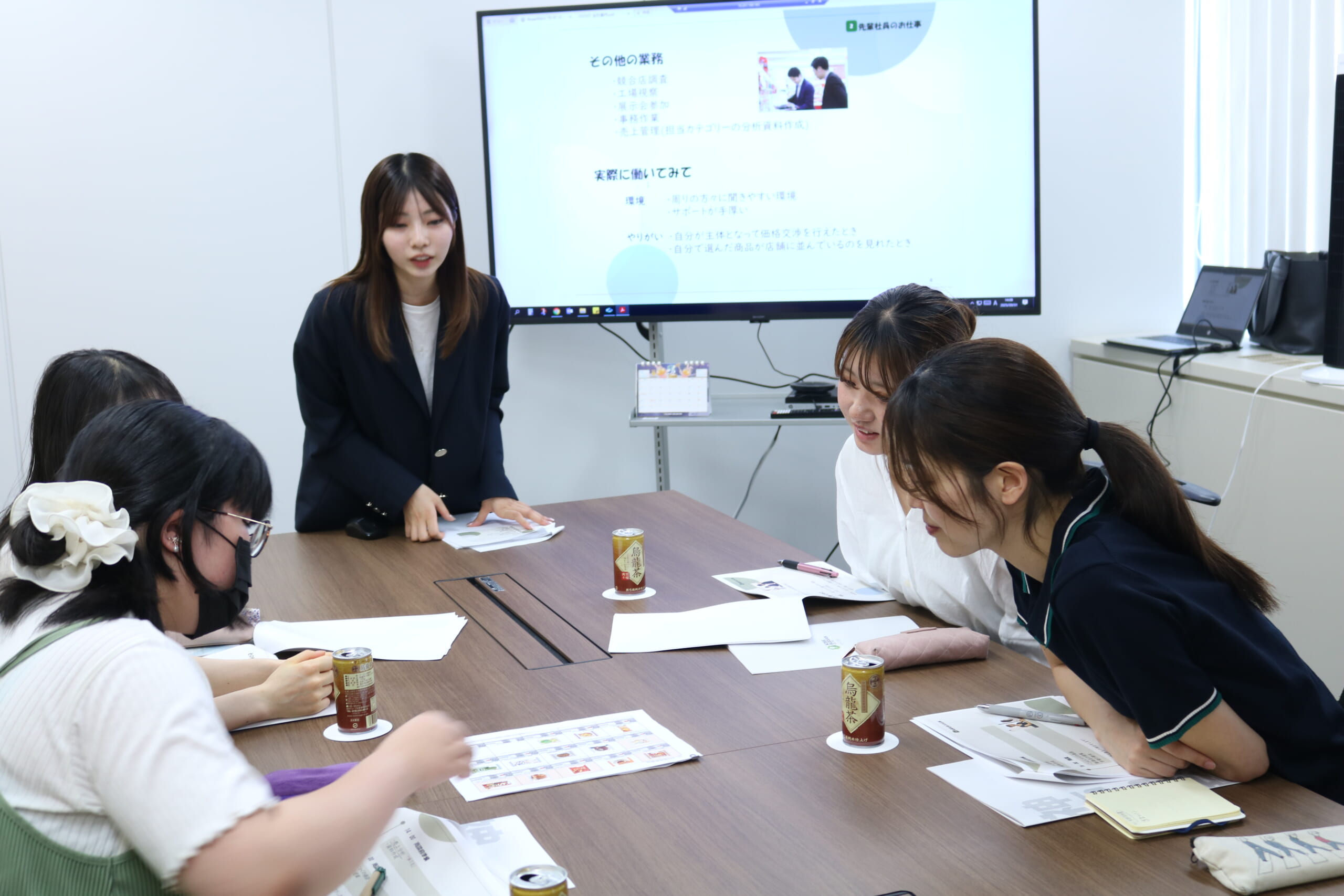 今回のインターンシップでは、バイヤー業務について実際に働いている卒業生の方にも、お話をしていただきました。研修の充実さや就職活動の進め方など様々なお話をお聞きし、とても貴重な時間になりました。その他特に印象に残っているのが、商談見学です。ベトナムの現地向けの商品や果物、ジュースを取り扱っている会社の方が来社され、実際の商談の様子を見ることができました。商談では、一つひとつの商品について細かく質問したり、過去の商品との違いを比較したりと販売する商品を決めるために、多くのプロセスを経て良い商品がお客様の手に届いていることを改めて知ることができました。私たち学生も商品の味見をさせていただきました。