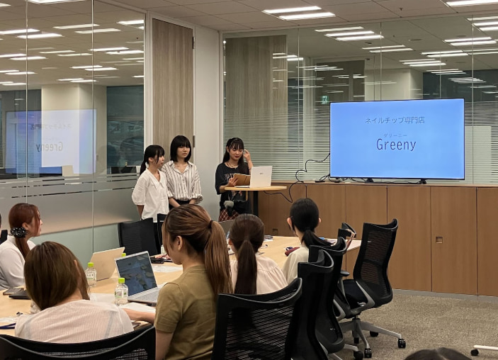 今回のインターンシップでは、【売れるお店】をチームで考え、実際にECサイトを作るというプログラムに挑戦しました。私たちのチームが提案したのは、ペットボトルのキャップから作るネイルチップです。ターゲットとなる顧客の年齢層や人数を把握して、どんなポイントがあれば購入につながるのかを探るために競合のリサーチを細かく行いました。この調査が想像以上に大変で、そこで改めてリサーチこそが売れるお店作りの土台になることが分かりました。