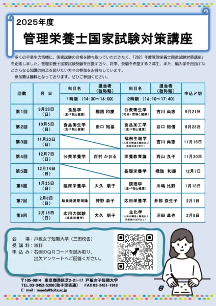 戸板女子短期大学 食物栄養科では、今年度も、管理栄養士国家試験対策講座を開催します。