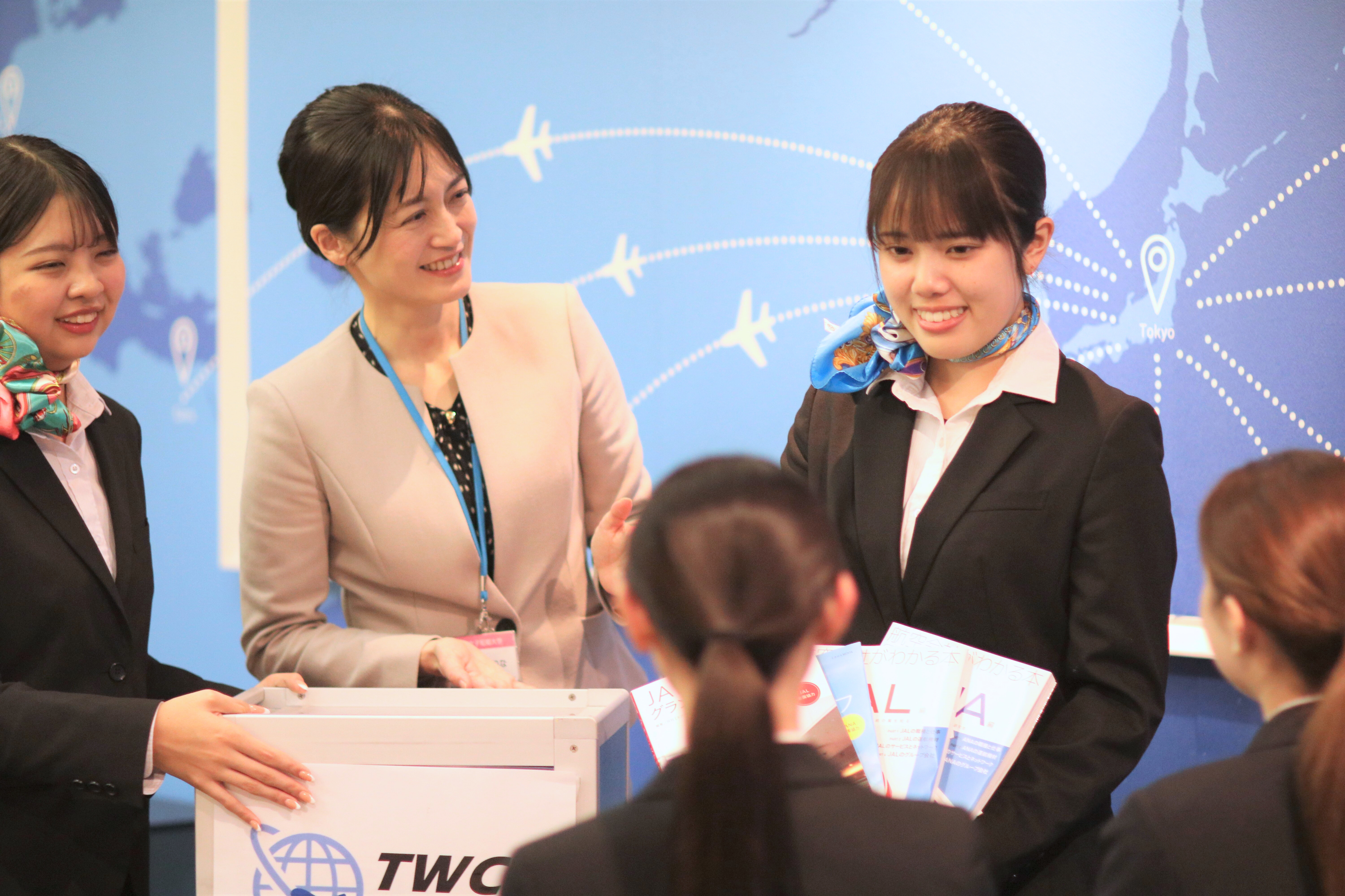 エアラインモデルの学生がCAやグランドスタッフになって、みなさんを素敵な空の旅へご案内いたします。授業で身につけたホスピタリティ力やマナー、アナウンス力などを体験してください。